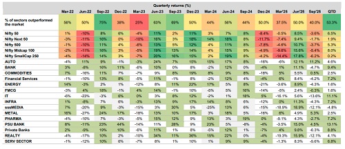 * 53% of the sectors have outperformed the Nifty 50 in the current quarter, indicating that a majority of the negatives are already priced in.