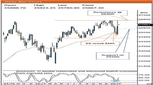* In the process, bouts of volatility amidst geopolitical development, inflation print and fag end of earnings season cannot be ruled out. In this backdrop, any decline should be capitalized to accumulate quality stocks with strong earnings as strong support is placed at 25200 being 61.8% retracement of recent up move (24571-26341) coincided with 200 days EMA