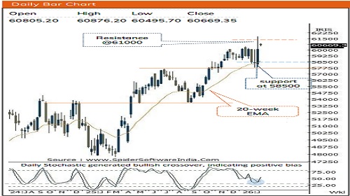* Near term, volatility is likely to stay elevated ahead of the upcoming inflation data. Any corrective declines from current levels should be viewed as buying opportunities as strong demand zone is identified near 59,300, being 50-day EMA and 61.8% retracement of the current up move (57,783-61,674).