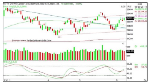 Indian Markets ended sharply higher today as optimism built up ahead of TCS' Q2 results. The Nifty climbed steadily after an early bout of volatility to close above the 25,180 mark, supported by gains in metal, IT, and healthcare stocks. The S&P BSE Sensex advanced 398.44 points or 0.49% to 82,17210. The Nifty 50 index added 135.65 points or 0.54% to 25,181.80.