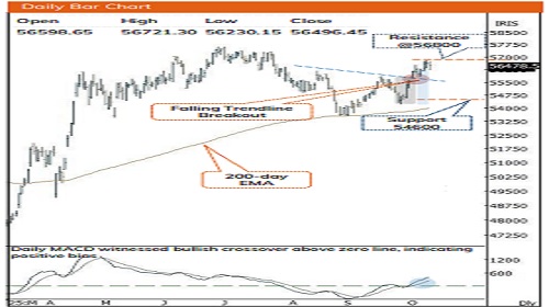 * Index continues to exhibit strength as it sustain above its key moving averages and its previous gap-up support zone near 55,700, indicating resilience amid prevailing global uncertainties. Key point to note is that post 2500 point rally, Index is currently consolidating in the 600 points range, indicating breather after recent up move. A decisive breakout above this level would signal resumption of the uptrend and open the door for a move towards the all-time high of 57,600 in coming months. Therefore, any dip from current levels should be seen as a buying opportunity, with immediate support placed near 54,600, representing the 80% retracement of the ongoing up move (54,226-56,164).