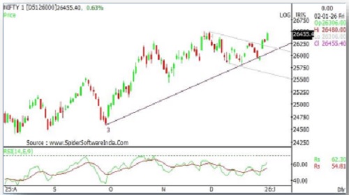 * On technical grounds, Nifty has an immediate Resistance at 26570. If Nifty closes above that, further upside can be expected towards 26690-26740 mark.
