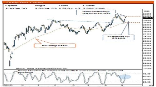 * The index continued its higher-high-higher low formation for the fourthconsecutive session. Going ahead, we reiterate our view that the ongoing upmove is likely to accelerate the upward trajectory, paving the way for Nifty to challenge its recent swing high 26,100 and eventually resolve higher towards lifetime high zone near 26,300 by December 2025. In the process, bouts of volatility owing to the Bihar election outcome cannot be ruled out. However, any dip from hereon should not be construed as negative instead capitalized it as buying opportunity in quality stock as strong support is placed at 25100.