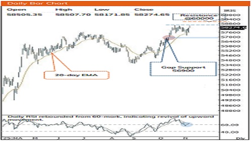 * Momentum indicators such as the RSI continue to sustain above the 60 level on both weekly and monthly timeframes, maintaining a positive medium-term bias. Hence, focus should be on accumulating quality stocks on dips backed by strong earnings as immediate support is placed near 56,900, corresponding to the 38.2% retracement of the ongoing advance (54,226–58,577).
