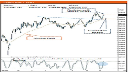 * The index continued with its northbound journey and approached psychological mark of 26000. However, profit booking from higher levels dragged index near Wednesday’s close. Consequently, daily price action formed a doji like candle, indicating breather ahead of Bihar election outcome.