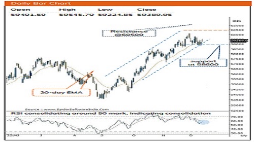 * Today index is likely to witness gap down opening tracking subdued global cues. The Banking index has been consolidating in 1500 points range over past four weeks. Therefore holding lower band of consolidation 60100-58600 would keep pullback option open towards upper band of consolidation at 60100. Over the past 14 weeks, Bank Nifty has surged ~12%, clearly outperforming the 7.5% gain in the Nifty50 and reinforcing the sector’s strengthening leadership within the broader market.
