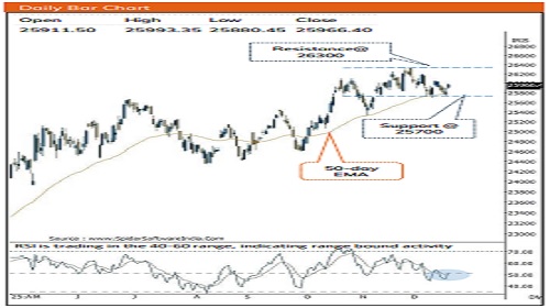* Despite the elevated volatility, the index continues to hold firmly Key point to highlight is that, past three week’s corrective phase has been captured in a well-defined downward sloping channel. Friday’s sharp rebound has brought the index closer to upper band of downward slanting channel. The resolute breakout from falling channel (at 26050) would confirm resumption of uptrend, Paving the way to challenge All Time High around 26300 and eventually open the door for next leg of up move towards 26700 in the coming month.