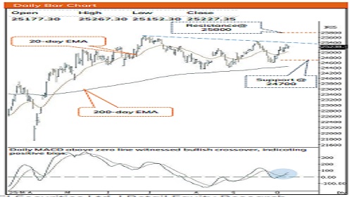 * Key point to highlight is that, post gap-down opening index consolidated in the vicinity of 25200 and managed to closed above it indicating inherent strength. We expect Nifty to gradually head towards short term milestone of 25800 with elevated support at 24700 which is 80% retracement of the current upmove. Bouts of volatility amid global development as well as ongoing earning season would offer incremental buying opportunity. Our positive bias is further validated by following observations: