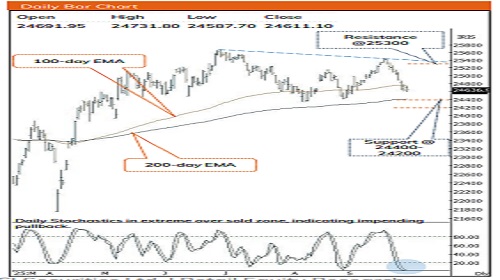 * The current profit booking is more of retracement of prevailing uptrend as Nifty has retraced 80% past three weeks >1000 points up move. Meanwhile, it is important to note that, with >800 points decline Nifty has entered the oversold territory while trading in the vicinity of 100-day EMA, indicating possibility of impending pullback cannot be ruled out. Going ahead, a decisive close above 24800 would indicate pause in the down move and will eventually pave the way towards 25300 in coming weeks, failing to do so, we expect Nifty to consolidate amid stock specific action wherein strong support is placed in the range of 24400-24200 zone.