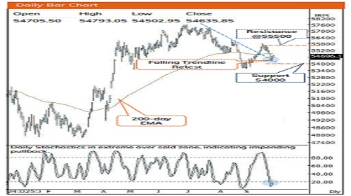 * Following favorable GST reforms, focus now shifts to tariff negotiations, where any constructive outcome could act as a potential catalyst. Therefore, any dip from current levels should be seen as a buying opportunity, with immediate support placed near 54,000, representing the 80% retracement of the ongoing up move (53,561-55,835).