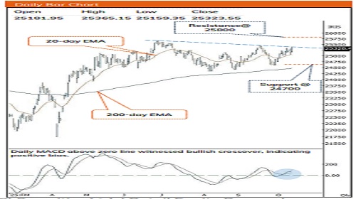 * Key point to highlight is that, Nifty closed above 25300 levels (highest in past 16 sessions) and is consolidating near one-year falling trendline (25450) while sailing through tariff concerns, quarterly earnings. Therefore, a decisive close above it would confirm conclusion of corrective bias which will indicate the structural change that will open the gate towards short term milestone of 25800 with elevated support at 24700 which is 80% retracement of the current upmove. Our positive bias is further validated by following observations: