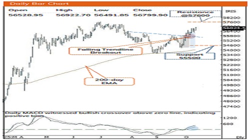 * Key point to highlight is that, after a brief pause in the prior session, Index resumed its upward trajectory and closed above the threesession identical high placed near (55760), indicating inherent strength. Going ahead, follow through strength above this level would signal resumption of the uptrend and open the door for a move towards the all-time high of 57,600 in coming months. Therefore, any dip from current levels should be seen as a buying opportunity, with immediate support placed near 55,500, representing the 50% retracement of the ongoing up move (54,226-56,922).
