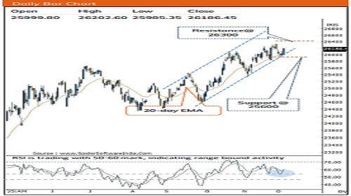 * The lack of follow through strength above 26300 would result into prolonged consolidation in 26300-25700 range amid elevated volatility ahead of upcoming Fed policy and inflation print. Hence, dips should be utilized to accumulate quality stocks as key support is placed at 25700 as it is 61.8% retracement of Nov-Dec rally (25318-26325) coincided with 50 days EMA.