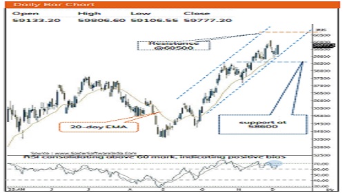 * Levels Buy on declines near 80% retracement of Fridays upmove(59556- 59680)
