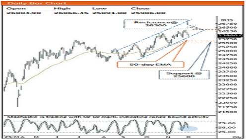 * The Index opened on a flat note and drifted gradually lower in early trade and then remained range-bound for most of the session. A late rebound in the last half hour helped trim losses, and the index eventually settled above its 20-day EMA (25968). As a result, daily price action formed a small bear candle with wicks on both ends, indicating near term consolidation phase.
