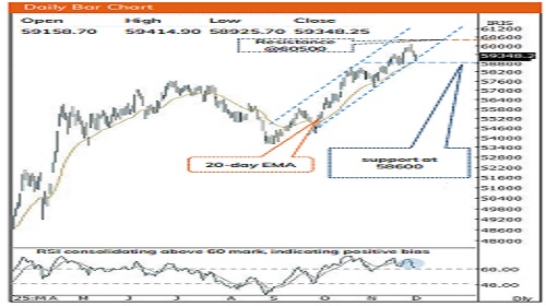 * Key point to highlight is that, past ten weeks price action has been captured in a well-defined rising channel. In last session, supportive efforts from lower band of rising channel helped index to maintained the sequence of higher high-low formation. Hence, follow through strength along with a decisive close above previous session high would confirm resumption of uptrend that would help index to challenge the All Time High and head towards 60500 in coming weeks. Hence, traders should adopt buy-on-dips approach in fundamentally strong banking names, particularly those that delivered robust Q2 earnings as immediate support is placed near 58,600, which also coincides with the 50% retracement of the recent upmove from (57157-60114)