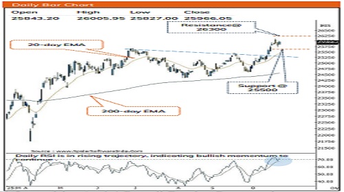 * Key point to highlight is that, after two-session of healthy profit booking, the index staged a firm rebound from the 38.2% retracement level of the prior up move (25060-26104), indicating a strong revival of bullish momentum. Going ahead, we believe index to resolve higher and challenge its all-time high 26,300 in coming month. Additionally, on the momentum front, the RSI in all major time frames is sustaining above the 60 mark, indicating strong bullish momentum. Hence any dips from current level should be viewed as a buying opportunity to accumulate quality stocks with robust earnings as strong support is placed at 25400. Our positive bias is further validated by following observations: