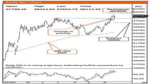 * Key point to highlight is that the index witnessed a strong rebound after taking support near its previous all time high zone, reaffirming the change of polarity principle where prior resistance has turned into support, indicating underlying strength and reinforces the continuation of the primary uptrend. Meanwhile, momentum indicators such as RSI in all major timeframe is sustaining above the 60 reading, indicating strong bullish momentum. Hence, one should adopt a buy-on-dips strategy with immediate support placed near 56,850 representing the 38.2% retracement of the ongoing up move (54,226-58,261) and 20- day EMA.