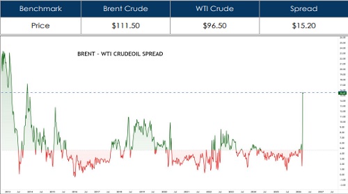 The "spread" represents the price difference between Brent (the international benchmark) and WTI (the U.S. benchmark). A widening spread means Brent is becoming significantly more expensive than WTI.