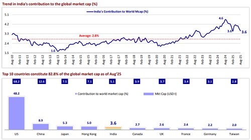 * India is among the top 10 contributors to the global market cap. The top 10 contributors accounted for 82.8% of the global market cap as of Aug’25.