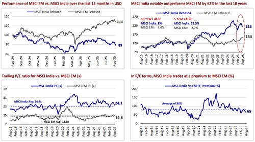 * India among the laggards in Aug’25: Among the key global markets, China (+8%), Brazil (+6%), Indonesia (+5%), Japan (+4%), Taiwan (+3%), the US (+2%), MSCI EM (+1%), and the UK (+1%) ended higher in local currency terms. However, Korea (-2%), India (-1%), and Germany (-1%) ended lower MoM in Aug’25. Over the last 12 months in USD terms, the MSCI India Index (-11%) underperformed the MSCI EM Index (+14%). Over the last 10 years, the MSCI India Index notably outperformed the MSCI EM Index by a robust 62%. In P/E terms, the MSCI India Index is trading at a 65% premium to the MSCI EM Index, below its historical average premium of 80%.