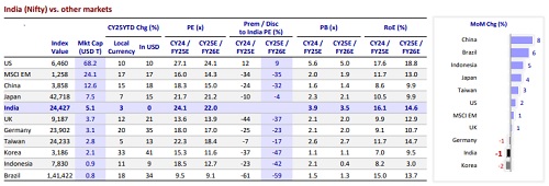 * Indian equities have been trading at 22x FY26E earnings. The key markets continued to trade at a discount to India.