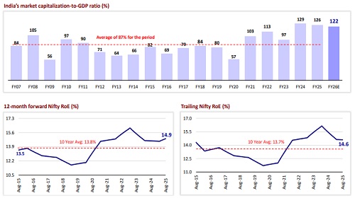 * India’s market cap-to-GDP ratio has been volatile, plummeting to 57% (of FY20 GDP) in Mar’20 from 80% in FY19 and then sharply rebounding to 132% in FY24 and 126% in FY25. It now stands at 122% of FY26E GDP (10.5% YoY), well above its long-term average of 87%.