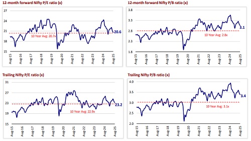 * The Nifty is trading at a 12-month forward P/E ratio of 20.6x, near its LPA of 20.7x. In contrast, its P/B of 3.1x represents an 8% premium to its historical average of 2.8x.