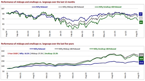* Market corrects for the second consecutive month in Aug’25: The Nifty ended 1.4% lower MoM at 24,427 in Aug’25 – the second consecutive month of a decline. Notably, with extreme volatility, the index hovered around ~816 points before closing 342 points lower. The Nifty is still up 3.3% in CY25YTD. The Nifty Smallcap 100 (-4.1% MoM) and Nifty Midcap 100 (-2.9% MoM) underperformed the Nifty-50 during the month. Over the last 12 months, largecaps, midcaps, and smallcaps have declined 3.2%, 6%, and 10.8%, respectively. Over the last five years, midcaps (CAGR: 27.3%) have significantly outperformed largecaps (CAGR: 16.5%) by 119%, while smallcaps (CAGR: 25.3%) have markedly outperformed largecaps by 93%.