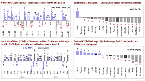 * Best and worst Nifty performers in Aug’25: Hero Motocorp (+19%), Maruti Suzuki (+17%), Eicher Motors (+12%), Titan (+8%), and Bajaj Auto (+8%) were the top performers, while Shriram Finance (-8%), Adani Enterprises (-8%), IndusInd Bank (-7%), Sun Pharma (-7%), and HDFC Bank (-6%) were the key laggards.