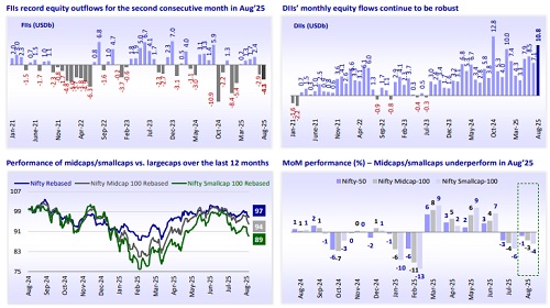 * DII inflows vs. FII outflows: In Aug’25, DIIs posted the second-highest ever inflows at USD10.8b after a record high in Oct’24. FIIs recorded the second consecutive month of outflows at USD4.3b. FII outflows from Indian equities reached USD15.3b in CY25YTD vs. outflows of USD0.8b in CY24. DII inflows into equities remained robust at USD59.4b in CY25YTD vs. USD62.9b in CY24.