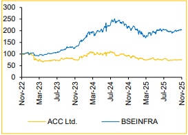 Accelerating growth with cost-efficient expansion: ACC is on track to strengthen its market position with ongoing capacity addition of 2.4 Mnt at Salai Banwa (Rajasthan) and 1 Mnt at Kalamboli (Maharashtra), slated for completion by Q3FY26E – taking the total cement capacity to ~43 Mnt. Further, the company’s plan to add another 5.8 Mnt through debottlenecking at an attractive capex of just ~USD 48/t underscores its focus on disciplined and high-return growth.