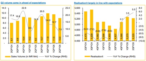 ACC reported Q2FY26 revenue and EBITDA of INR 58,525 Mn (includes government grants), (+27.0% YoY, -3.5% QoQ) and INR 8,195 Mn (+90.9% YoY, +6.0% QoQ). Total cement volume for Q2 stood at 10.0 Mnt (vs CIE est. 9.8 Mnt), up 7.5% YoY, and down 13.0% QoQ.