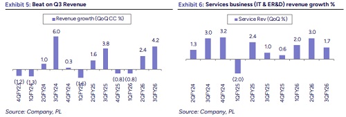 The revenue growth performance (+4.2% QoQ CC) was above our estimates (+3.0% QoQ CC), aided by strong seasonality of HCLSoftware (+28.1% QoQ CC). Services business performance was also strong (+1.8% QoQ CC) defying the furloughs and holidays impact. The service business growth was majorly led by ER&D segment that reported another quarter of strong growth (+3.1% QoQ CC vs 2.2% QoQ CC LQ). The service-led growth was largely aided by extop 20 accounts (+2.3% QoQ), which implies the decision making and execution cycle remains strong at the lower-end of the pyramid. Again, the advanced AI revenue growth (19.9% QoQ CC) is largely a component of short-burst deals that further validates the velocity of smaller deal remains strong. The new deal TCV reported at USD3.0b, which includes one of the mega deals (USD473m) of five-year strategic engagement. We believe the service-led growth should continue its momentum in FY27/FY28 on the back of strong order wins and growing AI revenue stream. Hence, we are revising the topline CC growth upward by 30bps/20bps to 7.0% and 7.7% for FY27E/FY28E. Despite the beat on margins in Q3, we expect Q4 will see some normalization, while additional new labour code would also keep the margin in check. The stock is currently trading at 22x and 19x FY27E/FY28E EPS. We assign 22x to FY28 EPS to arrive at a TP of 1,910.