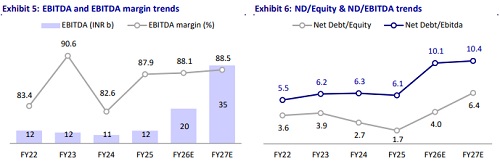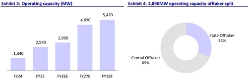* FY28E cut by 1% due to cancellation of the 300MW solar project: We cut our FY28E EPS by 1%, mainly owing to the 300MW solar project, which was cancelled recently. We have not yet included the recent 220MW solar + BESS tender win in our earnings estimates (link). In FY27/28E, we are modeling the commissioning of 1.9GW/0.5GW capacity, which drives an EBITDA CAGR of 74% over FY25-28E. We estimate 70% of the company’s debt is floating rate-linked, and a 25bp reduction in the interest rate can boost FY27/FY28 PAT by 12%/6%.