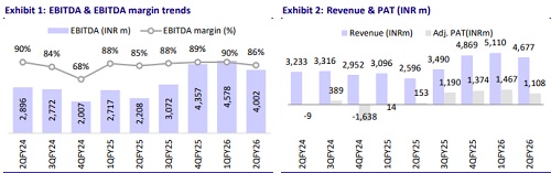 * EBITDA came in at INR4.0b (+81% YoY, -13% QoQ), in line with our estimate, with an EBITDA margin of 86%.