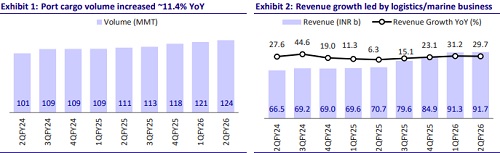 * Adani Ports & SEZ (APSEZ) reported revenue growth of ~30% YoY to INR92b in 2QFY26 (6% above our estimate). Cargo volumes grew 12% YoY to 124mmt, primarily led by containers.