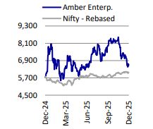 Consume durable segment demand has recovered on QoQ basis, but the RAC industry is still facing inventory issues. The company expects growth to pick up during 2HFY26, with a likely rebound expected during 4Q. Channel inventory remains high in the system. However, RAC industry will also witness BEE rating change from 1st Jan’26, leading to higher product prices, and hence, demand for earlier-rating products can see further uptick in the remaining 3QFY26. Higher copper prices and currency fluctuations can dent margins as these costs are generally passed on with a quarter’s lag. Overall, Amber expects to outperform industry growth by 10-15% as RAC industry is likely to remain flat in FY26 and as the company has expanded its product portfolio, which now includes a full CAC range up to 17.5 tons, and is scaling up component business. We expect consumer durable segment to grow by 11% in FY26.