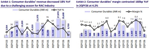 AMBER reported a weak set of numbers. 2Q is usually the weakest quarter for AMBER, mainly due to monsoons. Consolidated revenue growth was broadly flat YoY at INR16.5b vs our expectation of 20% growth, mainly due to lower-thanexpected demand in the consumer durables segment impacted by the monsoon and delayed purchases following GST 2.0. Gross margin expanded 40bp YoY to 20.5% vs our estimate of 18.0%. Absolute EBITDA declined 20% YoY to INR913m, indicating a miss to our estimates by 37%, while margins contracted 130bp YoY to 5.5% vs our estimate of 7.2%, mainly due to weakness in the consumer durables segment. The company reported a net loss of INR329m vs our estimate of a net profit of INR264m. For 1HFY26, revenue/EBITDA increased 25%/12% YoY, while PAT declined 23% YoY and EBITDA margin contracted 80bp YoY. For 1HF26, the company reported a net operating cash outflow of INR7.7b vs an outflow of INR2b last year, mainly due to an increase in working capital.