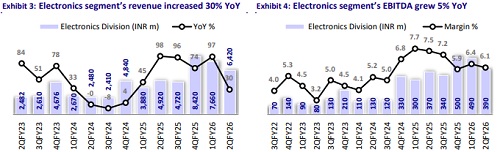 The electronics division continued to deliver strong growth, with revenue up 30% YoY in 2QFY26, driven by strong performance across both PCBA and bare PCB verticals. Margins were temporarily impacted by higher copper-clad laminate and gold prices, but management expects recovery to 8-9% by FY26-end, and anticipates reaching double digits in FY27, as these costs are passed on to customers with a one-quarter lag. Near-term growth will be supported by sustained demand from the consumer durables sector and incremental contributions from Power-One Microsystems, which expands AMBER’s presence in solar inverters, EV chargers, and battery energy storage systems. Over the medium-to-long term, AMBER is transitioning into a full-stack EMS provider across PCBA, bare PCBs, and complete box-build products for industrial automation and power electronics. The upcoming Ascent Circuits and Korea Circuit JV facilities will enhance its scale, self-reliance, and ability to offer end-to-end solutions. The company targets USD1b revenue in the next three years. We expect a revenue CAGR of 38% over FY25-28, with margins expanding to double digits by FY28, aided by a shift in the mix to higher-margin businesses such as Power-One (15-18%), Unitronics (25-28%), and bare PCBs (17- 19%)