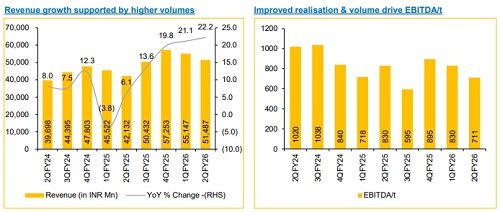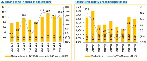 ACEM reported Q2FY26 revenue and EBITDA of INR 51,487 Mn (+22.2% YoY, -6.6% QoQ) and INR 7,044 Mn (+3.5% YoY, -19.2% QoQ) vs Choice Institutional Equities (CIE) estimates of INR 47,033 Mn and INR 6,259 Mn, respectively. Volume for Q2 stood at 9.9 Mnt, up 20.7% YoY, and down 5.7% QoQ.