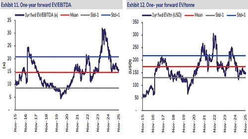 * Earnings Call KTAs: 1) The company reiterates its EBITDA/tn guidance of INR 1,450-1,500 by FY28; it also expects EBITDA/tn for Penna and Sanghi to gradually ramp up and reach four-digit levels. 2) The company targets to reach capacity of 118mt and 130-135mt by FY26 and FY27, respectively, and has upgraded its FY28 target capacity from earlier 140mt to 155mt. This additional 15mt (clinker backed) expansion is to be added through debottlenecking/ new plants at a capex of ~USD 48/tn. 3) It aims to increase its clinker capacity from 73mt to 81mt by FY27 and 96mt (vs. earlier 84mt) by FY28, respectively. 4) The company targets to achieve total cost/tn of INR 4,000 by FY26 (~INR 200/tn reduction in 2H), and further ~5% reduction YoY for the next 2 years, translating to cost/tn of INR 3,800 by FY27 and INR 3,600-3,650/tn by FY28, respectively. This reduction mainly to be driven by ~INR 50/tn in RM cost, ~INR 200/tn in P&F cost, ~INR 100/tn in freight cost and ~INR 50/tn in other overheads. 5) Expansion updates: i) Commenced trial run at 4mt new kiln line at Bhatapara; ii) Commenced operations at 2mt Krishnapatnam GU, taking its total capacity to 4mt; iii) Targets to commission 2.4mt Salai Banwa, 2.4mt Marwar, 1.2mt Dahej and 1mt Kalamboli in 3QFY26 and remaining 5.6mt by 4QFY26; 6) Plants of Orient, Penna and Sanghi have moved ~100% into Adani Cement, which led to a higher sales promotion cost of INR 30/tn in 2Q, while maintenance cost for these assets stood at INR 42/tn. 7) Guided capex of ~INR 80bn p.a. 8) On the RMX front, it expects the segment to consume ~5% of cement by FY28 vs. current 2%.
