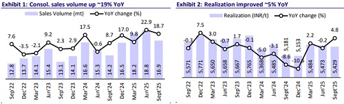 * Consol. revenue/EBITDA/adj. PAT stood at INR91.7b/INR17.6b/INR5.6b (up 24%/81%/14% YoY, and +4%/+28%/+35% vs. estimates) in 2QFY26. Consol. volume rose ~19% YoY to 16.9mt (+4% vs. estimate). Blended realization/t increased ~5% YoY but declined ~1% QoQ (~1% below estimates).