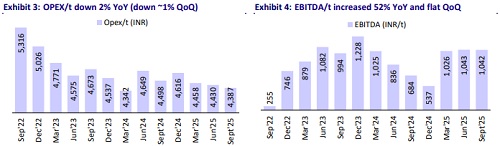 * Opex/t was down ~2% YoY/1% QoQ (~5% below our estimate), led by ~7%/ 5% decline in variable/freight cost/t. Other expenses/t increased ~15% YoY partly due to the integration of recently acquired assets. EBITDA/t grew ~52% YoY to INR1,042, and OPM surged 6pp YoY to ~19%. Depreciation increased ~70% YoY, driven by inorganic expansion. Other income declined ~31% YoY. ETR stood at 29.3% vs. 33.3% in 2QFY25.