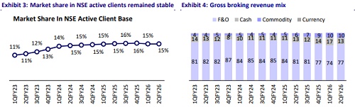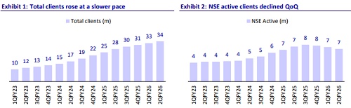 * Average client funding book witnessed a substantial growth of 26% QoQ to INR53.1b (INR42.1b in 1QFY26). Net interest income grew 5% QoQ to INR2.9b. The exit MTF book for 2QFY26 stood at INR59.5b.
