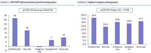 We initiate coverage on ANTHEM with ‘BUY’ rating and TP of INR755/share, implying ~16% upside from current levels. Growth visibility remains strong given a deep pipeline spanning discovery to late-stage development, along with a commercial portfolio. Demand for commercialized molecules should remain healthy, supported by the ramp-up of recently launched molecules and potential commercialization of late - stage programs. The specialty ingredients business is expected to benefit from GLP - 1 API ramp-up from H2CY26. With INR10-12bn capex planned, largely through internal accruals, ANTHEM is expanding capacity to support future growth.