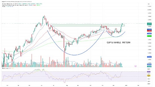 * The pattern was decisively broken with strong volume, confirming the breakout. Post breakout, the stock is showing strength and is currently trading above the 20-day EMA, 50-day EMA and 200-day EMA, indicating a positive shift in trend.