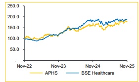 Strong Growth Outlook across Core Verticals: APHS’s hospital business is poised for steady growth, supported by an aggressive capacity ramp-up, from 10,200 to ~14,600 beds over the next 5 years and sustained EBITDA margin of around 24%. The diagnostics arm (AHLL) is targeting ~15% revenue growth with a ~200 bps margin uplift, driven by expansion in primary care and diagnostic services. Apollo HealthCo (pharmacy) is expected to deliver ~20% revenue CAGR, underpinned by stronger penetration in high-potential emerging cities and deeper integration across the healthcare ecosystem.