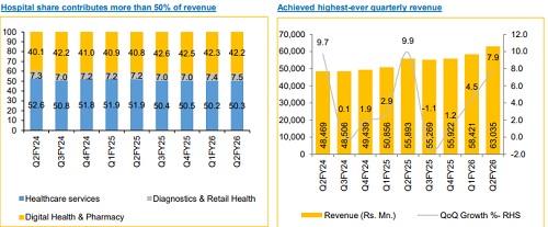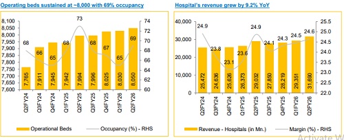 Revenue of Apollo’s hospitals grew 9% YoY to INR 31,690Mn in Q2FY26, with EBITDA margin steady at 24.6%. The quarter saw a dip in seasonal medical admissions but higher surgical and complex case mix. APHS is entering a capacity-led growth phase with six hospitals set to be commissioned over FY26– 27 across in key metros like Delhi, Hyderabad, Bengaluru and Gurugram. Management expects ~13% organic growth in existing beds and ~5% from new capacity over the next few years. We believe that, combining a high-acuity case mix with disciplined expansion and cost optimisation, positions APHS as India’s benchmark in clinical and operational excellence.