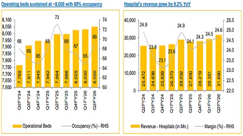 Revenue of Apollo’s hospitals grew 9% YoY to INR 31,690Mn in Q2FY26, with EBITDA margin steady at 24.6%. The quarter saw a dip in seasonal medical admissions but higher surgical and complex case mix. APHS is entering a capacity-led growth phase with six hospitals set to be commissioned over FY26– 27 across in key metros like Delhi, Hyderabad, Bengaluru and Gurugram. Management expects ~13% organic growth in existing beds and ~5% from new capacity over the next few years. We believe that, combining a high-acuity case mix with disciplined expansion and cost optimisation, positions APHS as India’s benchmark in clinical and operational excellence.